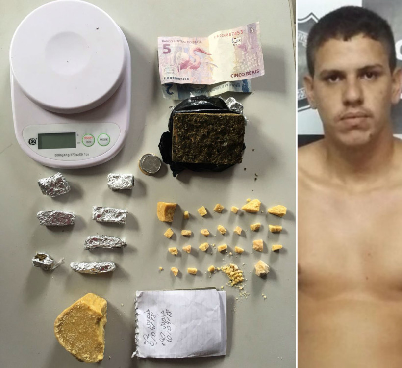 Um suspeito de prática de tráfico de drogas foi preso na tarde de sexta-feira (13) durante uma ação integrada das Polícias Civil e Militar de Caldas Novas. Ítalo Carvalho (à direita na foto), 21 anos, foi flagrado no em sua residência mantendo, em depósito, produtos suspeitos de se tratar de maconha e pasta base de cocaína. Também foram apreendidas uma balança de precisão e a anotações relativas à contabilidade do tráfico por ele realizado (à esquerda na foto). Após a lavratura do Auto de Prisão em Flagrante, Ítalo será recolhido no presídio local, onde permanecerá à disposição da justiça.