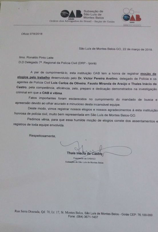 A Polícia Civil de São Luís de Montes Belos recebeu um elogio formal por parte da subseção do município da Ordem dos Advogados do Brasil (OAB). A moção foi motivada por uma investigação criminal promovida pela Delegacia de Polícia da cidade e que tinha a entidade como vítima.