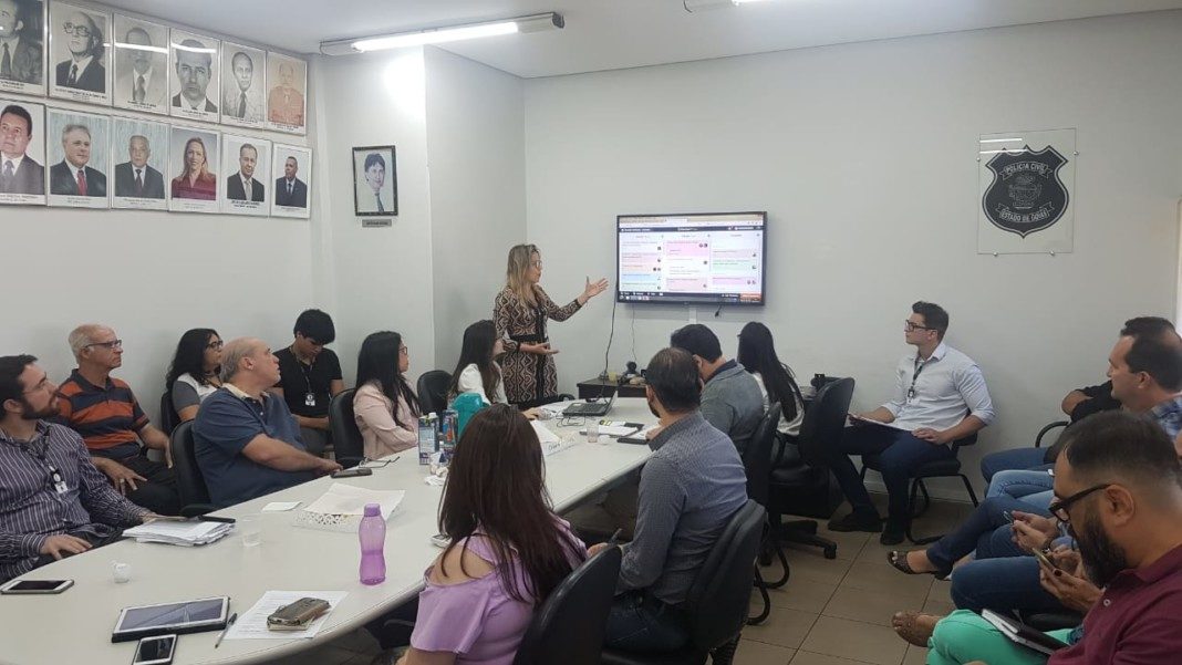Na manhã desta segunda-feira (30/07), a coordenadora de modernização e planejamento da Polícia Civil, Ana Flávia Adorno, juntamente com a chefe do planejamento estratégico, Vanessa Balduino, apresentaram ao delegado-geral, André Fernandes, ao delegado-geral adjunto, Reinaldo Koshiyama, ao gerente de gestão e finanças, Eraldo Augusco, e ao gerente de gestão e finanças adjunto, Murilo Gonçalves, a nova ferramenta de monitoramento dos trabalhos realizados pelos coordenadores e chefes de núcleos da Gerência de Gestão e Finanças da PCGO.