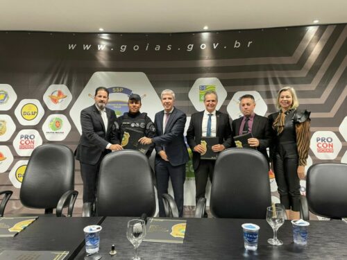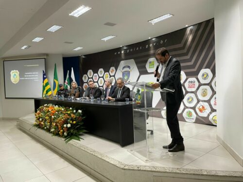 Compuseram a mesa o delegado-geral da Polícia Civil de Goiás, Alexandre Lourenço, o delegado-geral adjunto Reinaldo Koshiyama, a superintendente de Polícia Judiciária Ana Cláudia Stoffel, o gerente de Gestão e Finanças da PCGO, Murilo Gonçalves, o diretor-geral da Polícia Penal de Goiás, Josimar Pires, e o subsecretário de Segurança Pública de Goiás, Deusny Aparecido.