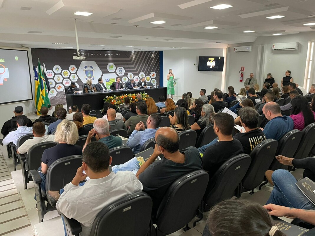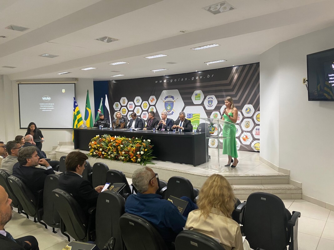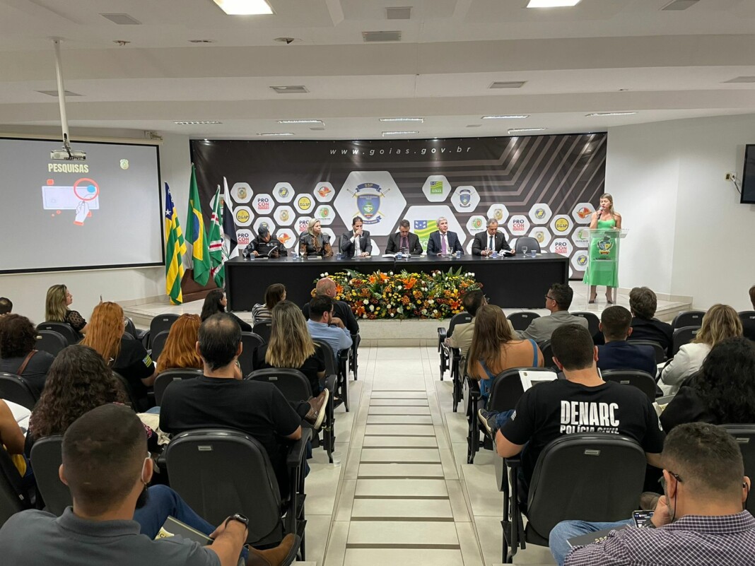 Compuseram a mesa o delegado-geral da Polícia Civil de Goiás, Alexandre Lourenço, o delegado-geral adjunto Reinaldo Koshiyama, a superintendente de Polícia Judiciária Ana Cláudia Stoffel, o gerente de Gestão e Finanças da PCGO, Murilo Gonçalves, o diretor-geral da Polícia Penal de Goiás, Josimar Pires, e o subsecretário de Segurança Pública de Goiás, Deusny Aparecido.