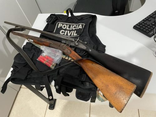 Em procedimento padrão, indagado se possuía armas ou outros ilícitos, ele informou que havia uma espingarda no imóvel que reside, tendo sido encontrada em seu quarto, atrás da porta, uma espingarda calibre 28 e cinco cartuchos do mesmo calibre, sem registro ou autorização para posse. Em outra casa, identificada como a casa sede, a equipe encontrou outra espingarda, do mesmo calibre, também sem documentação.