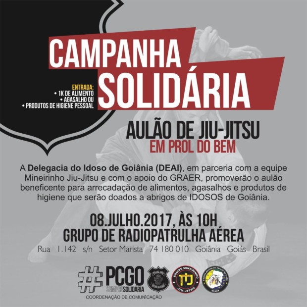 WhatsApp Image 2017-07-05 at 09.56.00A Delegacia do Idoso de Goiânia (Deai), em parceria com a equipe Mineirinho Jiu-Jitsu e com o apoio do Grupo de Radiopatrulha Aérea (Graer), promoverá um aulão beneficente a partir das 10 horas de sábado (08) na sede do Graer. A iniciativa tem por objetivo a arrecadação de alimentos, agasalhos e produtos de higiene, que serão doados a abrigos de idosos da capital. A entrada será de 1 kg de alimento, agasalho ou produtos de higiene pessoal.