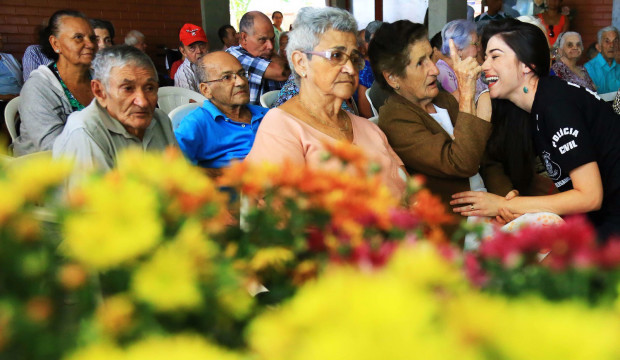 Flores, música e uma porção de mimos transformaram a manhã desta segunda-feira (9) em uma grande festa para os mais de 70 idosos do Abrigo Sagrada Família, no Jardim Bela Vista. Policiais civis da Delegacia do Idoso de Goiânia realizaram o “Dia da Rainha” para homenagear as mães da terceira idade, com espetáculo musical, distribuição de flores e kits de hidratantes e produtos de higiene pessoal e atendimento especial de maquiagem e cabeleireiro. A alegria tomou conta de mães, pais e demais idosos que caíram na dança e não economizaram sorrisos.