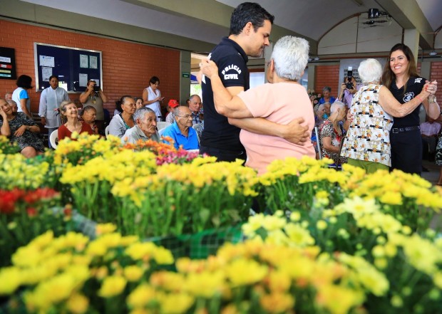 Flores, música e uma porção de mimos transformaram a manhã desta segunda-feira (9) em uma grande festa para os mais de 70 idosos do Abrigo Sagrada Família, no Jardim Bela Vista. Policiais civis da Delegacia do Idoso de Goiânia realizaram o “Dia da Rainha” para homenagear as mães da terceira idade, com espetáculo musical, distribuição de flores e kits de hidratantes e produtos de higiene pessoal e atendimento especial de maquiagem e cabeleireiro. A alegria tomou conta de mães, pais e demais idosos que caíram na dança e não economizaram sorrisos.
