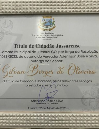 O delegado Gilvan Borges, titular da Delegacia de Polícia de Jussara, recebeu, na noite dessa quarta-feira (02), homenagem da Câmara Municipal de Jussara. Ele recebeu o título de cidadão jussarense e fez um discurso, na Casa Legislativa, em agradecimento.