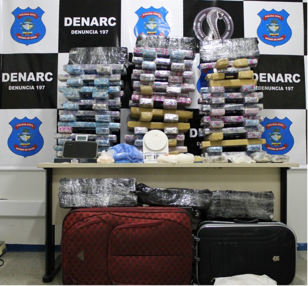 Policiais Civis coordenados pelo Delegado Vinícius Ney Barbosa após meses de investigação sobre ações de uma associação criminosa de tráfico de entorpecentes prendeu no último sábado, 13, duas mulheres e com elas mais de 150 kg de drogas. A organização que traficava entorpecentes, era chefiada por detentos da Penitenciária Odenir Guimarães em Aparecida de Goiânia, planejadas e executadas por dois homens, Artizone Araújo Filho, 55 anos e Leonardo Nascimento da Silva e três mulheres, Andriele Araújo de Freitas, 24 anos, Soleni Maria de Oliveira, 25 anos e Lorrayne Ferreira do Nascimento, 24 anos.