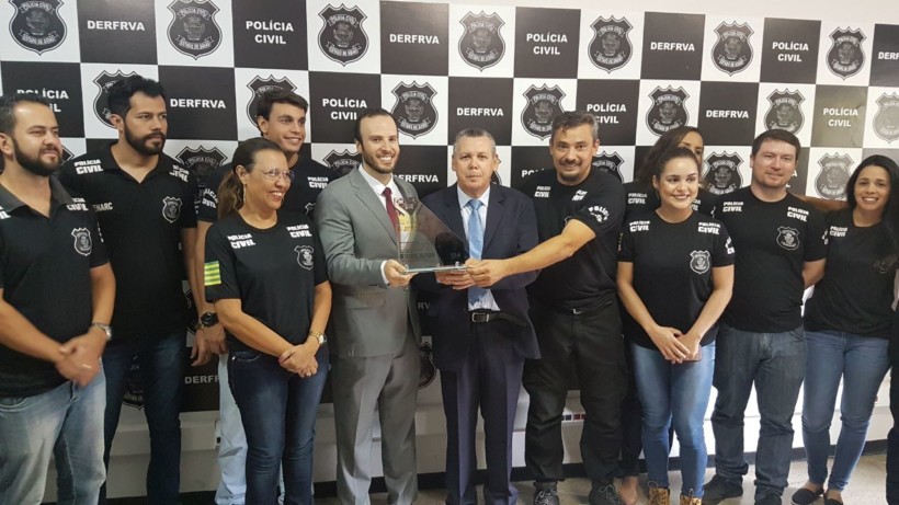 O delegado-geral da Polícia Civil, Álvaro Cássio dos Santos, esteve na manhã desta sexta-feira (02/02) na DERFRVA (Delegacia Estadual de Repressão a Furtos e Roubos de Veículos Automotores), onde entregou ao titular da Especializada, delegado Adriano Sousa Costa, o troféu “Delegacia Destaque” do mês de janeiro. Durante o evento, Álvaro destacou as operações constantes que têm sido realizadas pela unidade e que vêm contribuindo para a queda nos índices criminais.