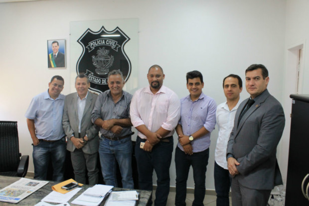 O delegado-geral da Polícia Civil de Goiás, Álvaro Cássio dos Santos, recebeu a visita do prefeito de Senador Canedo, Divino Lemes, na manhã de sexta-feira (03). O chefe do Executivo municipal se fazia acompanhar pelo presidente e vice da Câmara Municipal, respectivamente, vereadores Rodrigo Rosa e Carpegiani Silvestre.