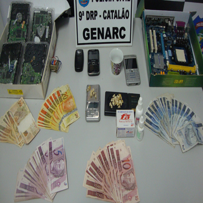 Dinheiro do tráfico e objetos apreendidos com os traficantes em Catalão