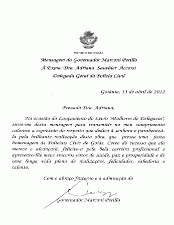 Mensagem do Governador Marconi PerilloApós a composição da mesa a organizadora do livro, a Escrivã de Polícia Geralda da Cunha Teixeira Ferraz, falou sobre como foi o processo de entrevistar, colher depoimentos e informações de cada homenageada e editar todas as histórias. As homenageadas Célia Cristina Gonçalves de Souza – Agente de Polícia, Lilian Lícia Teixeira Guerra Magalhães, Escrivã de Polícia e Lúcia Aparecida de Oliveira Silva, Delegada de Polícia,  fizeram seus discursos ressaltando a importância da obra. Em seguida, foi a vez da Delegada Gildeci Alves Marinho relatar uma história pitoresca que não faz parte do livro, com o objetivo de demonstrar que se fossem registrar todas as histórias seria preciso outras edições de livros.