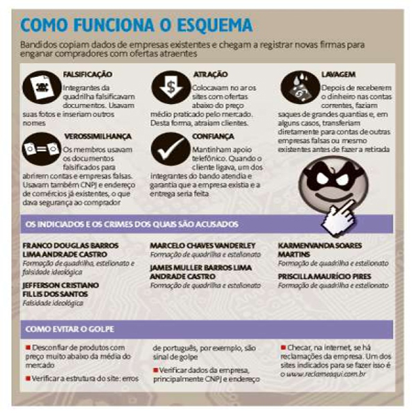 A estrutura da organização criminosa contava com esquema de maquiagem da fraude, com dados de empresas reais, e de lavagem de dinheiro, com a transferência de valores entre pessoas jurídicas, antes que fossem sacados pelos reais beneficiários. “A intenção deles é lavar o dinheiro”, afirma o delegado que presidiu o inquérito, Valdemir Pereira da Silva, da Delegacia do Consumidor (Decon).