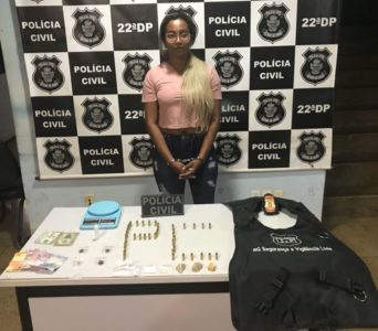 A mulher foi autuada pela prática dos delitos de tráfico de drogas e posse de munições de uso restrito, já que foi surpreendida mantendo sob sua guarda quatro pedras grandes de crack, três porções de maconha, três porções fragmentadas de cocaína, uma embalagem plástica contendo líquido conhecido como “loló”, uma balança de precisão, 43 munições calibre 9mm e um colete balístico.