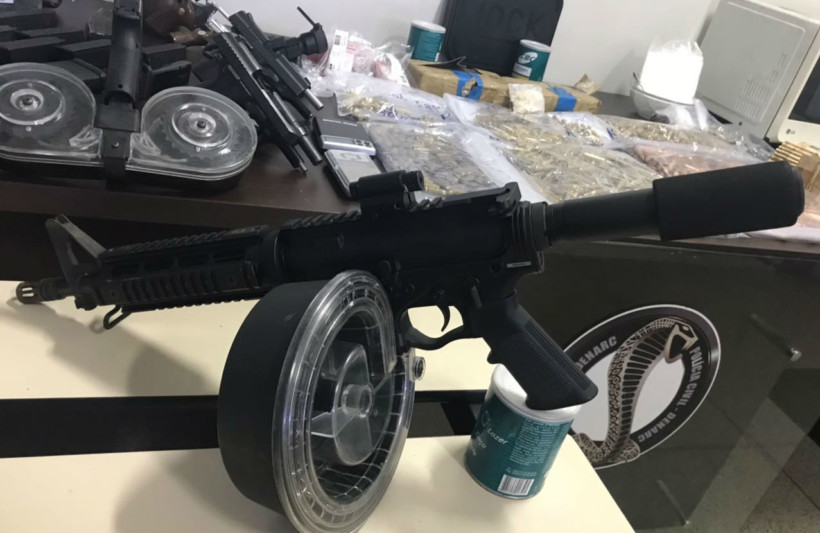 Na residência de Rodrigo, foram apreendidos 4,5 kg de cocaína “escama de peixe”, além de 35 kg de insumos destinados ao seu refino. Ademais, foram encontrados R$ 51 mil em dinheiro, um fuzil, uma espingarda calibre 38, outra calibre 22, uma pistola Glock calibre .45, além de carregadores “caracol”, tanto da pistola quanto do fuzil, com capacidade para 100 disparos ininterruptos, e 2.197 munições de diversos calibres.