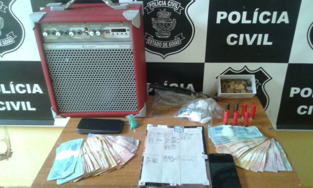 Foram apreendidos entorpecentes, munições de arma de fogo, celulares, dinheiro, plástico para embalagem da droga, agenda, além de objetos suspeitos de serem produto de furto e roubo.
