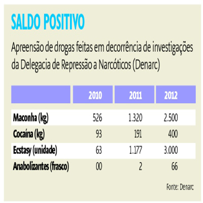 A Delegacia de Repressão a Narcóticos (Denarc) apreendeu somente neste ano mais de 2,5 toneladas de maconha, 400 quilos de cocaína, 3 mil comprimidos de ecstasy e 66 frascos de anabolizantes. O número é maior que a soma dos dois anos anteriores e não computa o que foi apreendido no interior do Estado e em operações da Polícia Militar.