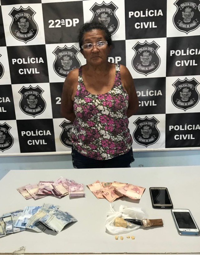 A Polícia Civil de Goiás prendeu em flagrante, nesta terça-feira (12), Maria José de Andrade Silva (65 anos), pela prática do crime de tráfico de drogas. Maria José estava guardando 1 porção média de crack (equivalente a 150 pedras), 9 pedras de crack prontas para a venda, 182 reais em dinheiro trocado, provenientes do tráfico, e 2 celulares.