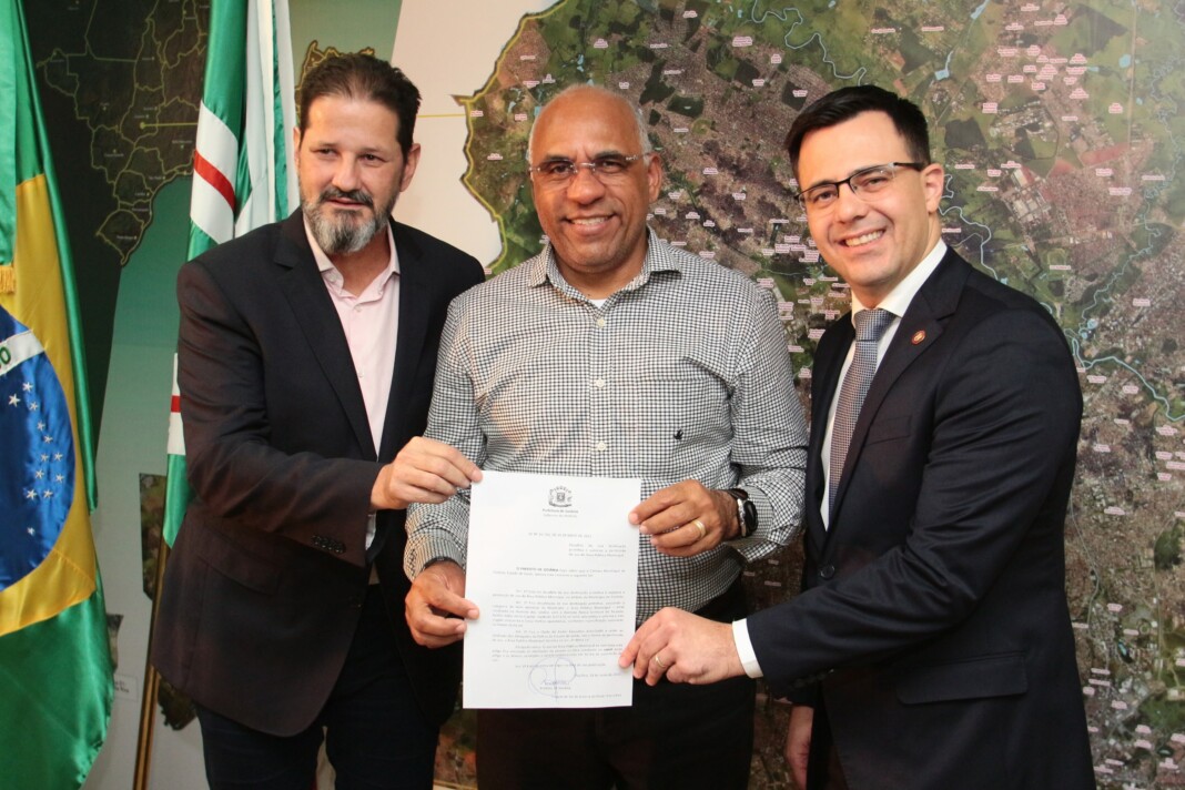 O delegado-geral da Polícia Civil de Goiás, no final da tarde de sexta-feira (20), no paço municipal, de uma reunião em que o Prefeito de Goiânia, Rogério Cruz, sancionou a lei nº 10.783/2022, que autoriza a cessão de uso de área pública de 1.673 m2, situada na Avenida dos Jardins, para o Sindicato dos Delegados de Polícia do Estado de Goiás.