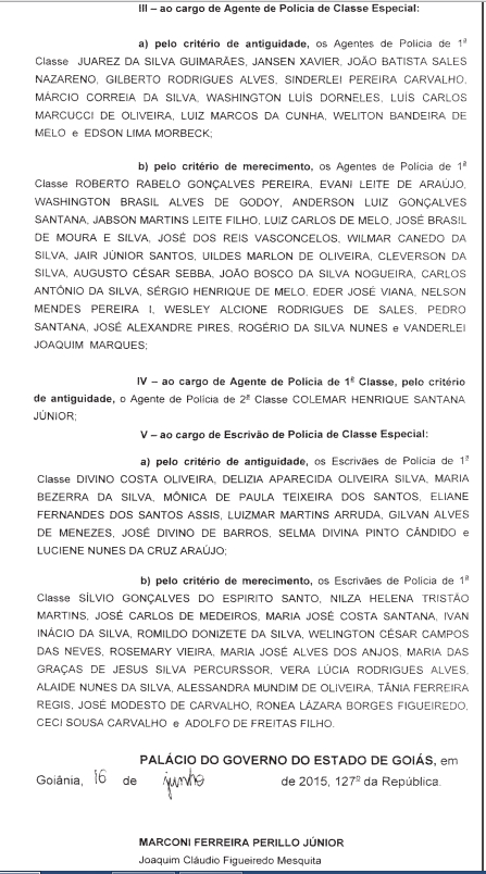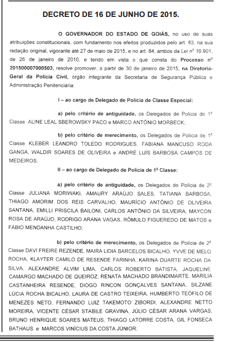 Foi publicado no Diário Oficial do Estado de Goiás de 18 de junho de 2015 o Decreto Estadual que formaliza as promoções dos policiais civis, referente ao mês de janeiro do corrente ano. O secretário de Gestão e Planejamento de Goiás, Thiago Peixoto, enviou à Casa Civil o processo que regulamentava as promoções, que por sua vez foi assinado pelo governador Marconi Perillo.
