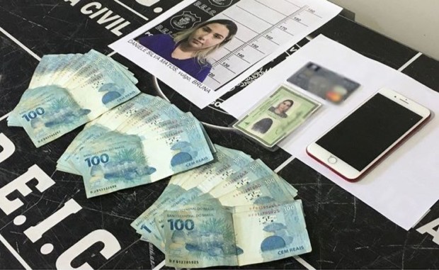 Após ser acionada pela instituição bancária, a equipe da Deic localizou Daniele a cerca de duas quadras da agência, quando esperava um Uber. Os policiais apreenderam com a mulher R$ 3 mil, um celular, a carteira de identidade falsa e o cartão. De acordo com a delegada, ela já havia gasto os outros R$ 1 mil que havia sacado na sexta-feira. Residente em Belo Horizonte, Daniele acreditava que levantaria menos suspeitas em sacar o dinheiro numa cidade mais próxima ao Distrito Federal, onde reside a verdadeira dona do dinheiro. (Fotos: Paula Resende/G1 Goiás)