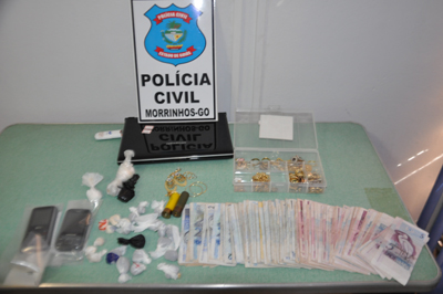 Com Adelaide foram apreendidas 14 porções de maconha, 03 porções de crack, 04 porções de cocaína, todas embaladas individualmente prontas para a venda. Também foram apreendidos 02 cartuchos calibre 20, R$502,00 (quinhentos e dois reais) em dinheiro e inúmeras peças de ouro e bijouterias, entre colares, pulseiras, brincos e anéis. Dentre as jóias apreendidas estavam 03 pares de brinco e uma pulseira, todos de ouro, que haviam sido furtadas há um mês atrás na sede de uma fazenda, situada próximo ao povoado.