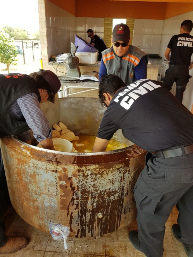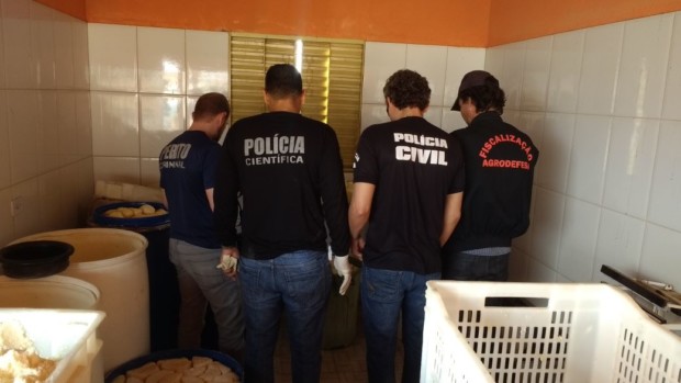A operação da Polícia Civil, que teve apoio da Agrodefesa e da Polícia Técnico-Científica, identificou grande quantidade de queijo vencido. “O queijo que era ralado tinha larvas e mofo e estava armazenado num lugar muito sujo”, contou o delegado. Parte do queijo ralado já estava embalada para repasse aos supermercados.