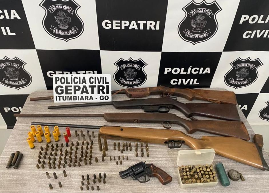 A Polícia Civil de Goiás, por meio do Grupo de Repressão aos Crimes Patrimoniais (Gepatri) de Itumbiara, coordenado pelo Delegado Lucas Finholdt, prendeu em flagrante delito, em Cachoeira Dourada, um indivíduo de 53 anos de idade pelo crime de posse de irregular de arma de fogo, insumos e munições de calibre permitido e de calibre restrito. O autuado estava sendo investigado pelo crime de ameaça em ambiente doméstico, praticada com uso de arma de fogo. Desta feita, a Polícia Civil representou pela busca e apreensão, a qual foi prontamente deferida pelo Poder Judiciário, após manifestação favorável do Ministério Público de Cachoeira Dourada.