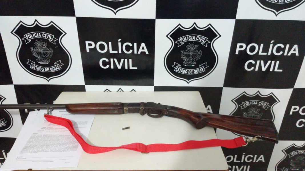 Após receber denúncia de violência doméstica, os policiais civis de Goianápolis dirigiram-se ao local indicado para apurar a veracidade da informação, ocasião em que constaram as ameaças e flagraram o autor na posse de uma espingarda calibre 36 e uma munição.