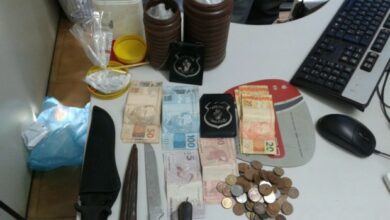 A equipe adentrou à residência de Fabiano, onde foram encontrados porções de drogas, dinheiro picado, facas e sacolas.