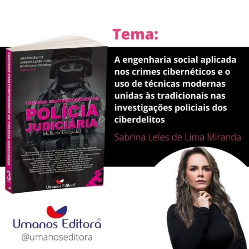 A delegada Sabrina Leles de Lima Miranda, titular da Delegacia Estadual de Repressão a Crimes Cibernéticos (DERCC) da Polícia Civil de Goiás, participou como coautora de um livro lançado neste mês. O livro “Tratado Contemporâneo de Polícia Judiciária – Vol. 03” foi escrito por 32 delegadas de vários estados brasileiros e trata de várias temáticas de investigação criminal. Sabrina Leles redigiu o artigo intitulado “A engenharia social aplicada nos crimes cibernéticos e o uso de técnicas modernas unidas às tradicionais nas investigações policiais dos ciberdelitos”. O livro está já está à venda com a partir do mês de julho.