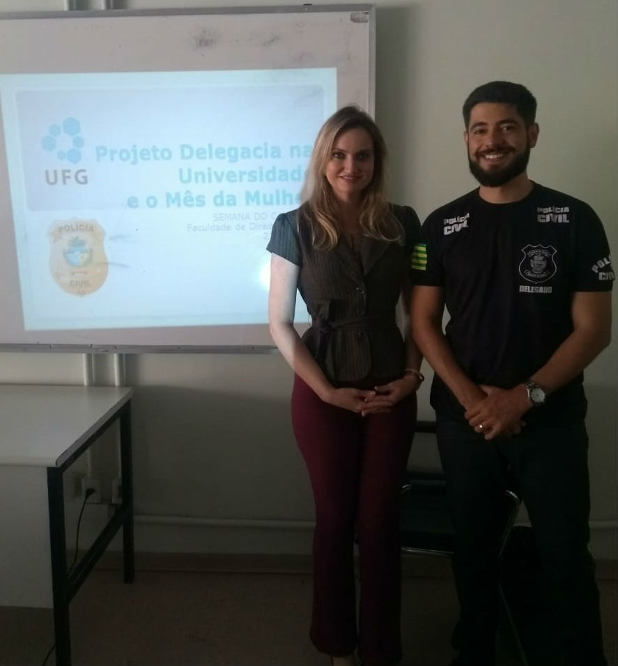 Os delegados de polícia Paula Meotti, da Delegacia da Mulher de Goiânia, e Daniel José da Silva Oliveira, da 1ª Delegacia Distrital de Trindade, participaram nessa quinta-feira (21) da Semana do Calouro da Faculdade de Direito da Universidade Federal de Goiás (UFG). O evento foi promovido pelo Centro Acadêmico XI de Maio, com a oficia “Delegacia na Universidade e o Mês da Mulher”, que tratou da Lei Maria da Penha e do trabalho especializado de atendimento policial à mulher vítima dos crimes de violência doméstica e familiar.