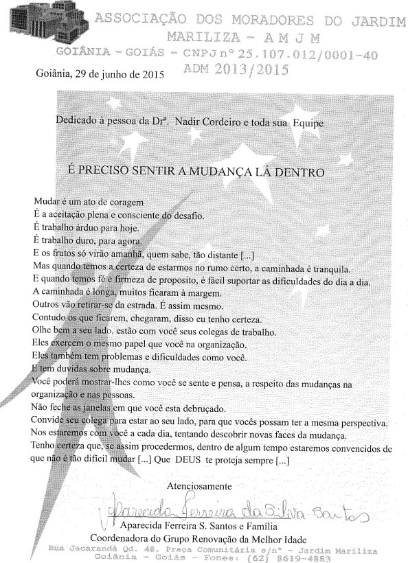 O evento foi coordenado pelo líder da Associação dos Moradores do Jardim Mariliza, Mário Ferreira dos Santos, e por sua esposa, Aparecida Ferreira dos Santos, coordenadora do Grupo Renovação da Melhor Idade, que ofereceu um poema à delegada (veja foto). Segundo Nadir Cordeiro, todos os envolvidos que fizeram uso da palavra na ocasião foram unânimes em reconhecer que os índices de criminalidade na região foram diminuídos após a ida de Nadir para o 24º DP.