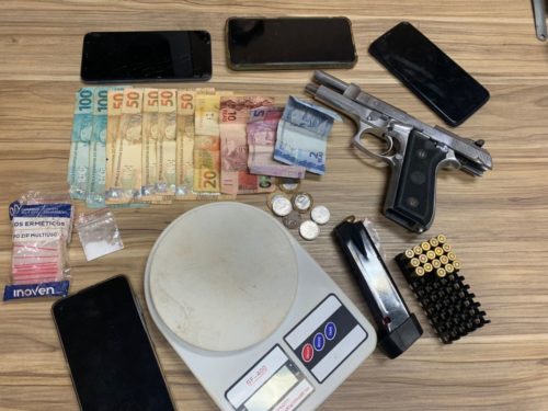 Após levantamento de um endereço apontado como ponto de vendas de drogas, foi realizada busca e apreensão. Na ocasião, foram apreendidos uma pistola calibre 9mm com carregador municiado, bem como 18 munições calibre 9mm, uma balança de precisão, vários sacos herméticos, 02 sacos herméticos com resquícios de droga, 01 saco contendo substância semelhante a cocaína, 04 aparelhos celulares e R$ 490,00 em espécie.