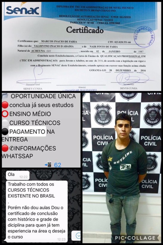 A Polícia Civil realizou, no dia 12 de abril de 2017, a Operação “Sem estudo”, para investigar e prender responsáveis pela venda de diplomas de ensino médio falsificados. Na ocasião, André Vinicius de Ferreira Lima foi preso em flagrante pelo crime de receptação, já que era a pessoa responsável pela entrega dos referidos certificados aos clientes.