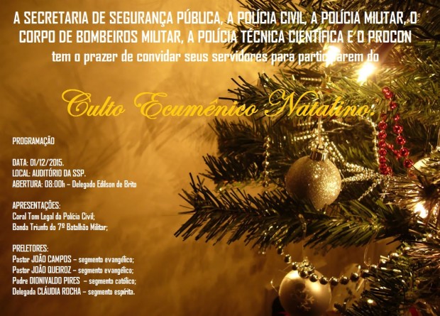 A Secretaria de Segurança Pública (SSP) realiza, na próxima terça-feira (1º), um culto ecumênico natalino. O evento é organizado pelas polícias Civil e Militar, pelo Corpo de Bombeiros, Polícia Técnico-Científica e Procon e será realizado no auditório da SSP, às 8h. Todos os servidores estão convidados para o encontro, uma tradição da pasta.